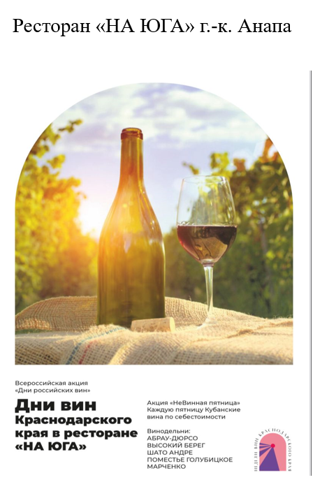 Департамент потребительской сферы и регулирования рынка алкоголя Краснодарского края информирует о проведении акции «Дни вин Краснодарского края». На территории Краснодарского края Акция проводится с 2021 года. Цель Акции - продвижение и популяризации вин региональных производителей, в которой активное участие принимают предприятия общественного питания и розничной торговли региона.В период зимнего курортного сезона проведение Акции на территории Краснодарского края запланировано в период с 15 декабря 2025 г. по 30 марта 2026 г. Для участия в мероприятии партнеры Акции используют информационный материал с логотипом мероприятия (ценники, топперы, воблеры, тейбл-тенты, вкладыши в меню).