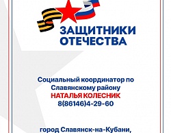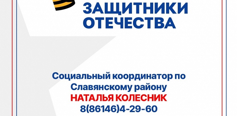 Социальным координатором по Славянскому району является Колесник Наталья Юрьевна, телефон: 8(86146)4-29-60; адрес местонахождения: г. Славянск-на-Кубани, ул. Ленина, д. 14, (управление социальной защиты населения).