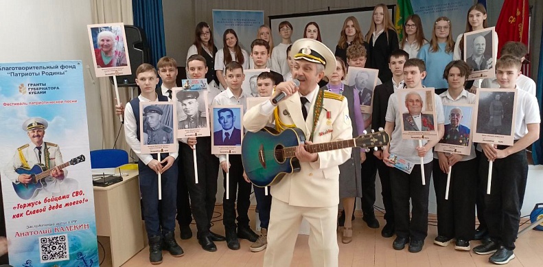 23 января А.С. Калекин - Заслуженный артист России, капитан второго ранга в отставке, руководитель благотворительного фонда «Патриоты России», трижды удостоенного гранта Президента России, провёл концерт в школе № 5 г. Славянска-на-Кубани.