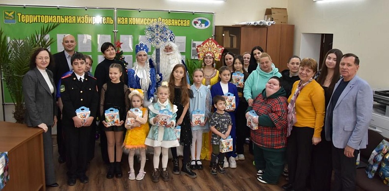 В преддверии Нового 2026 года территориальная избирательная комиссия Славянская провела Благотворительную акцию для детей членов участковых избирательных комиссий Славянского района, чьи родные участвуют в специальной военной операции. Дед Мороз (заместитель председателя ТИК Славянская Руслан Гогохиа) и Снегурочка (член ТИК Славянская Татьяна Чубаева) радостно встречали детей возле новогодних ёлок.