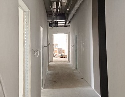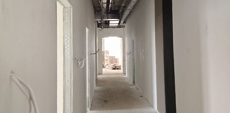 Сейчас в здании ведутся отделочные работы, шпатлевка и окраска стен, облицовка плиткой.